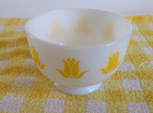 Title (ebay affiliate link): Vintage Fire King Yellow Tulip Footed Cottage Cheese Milk Glass Bowl