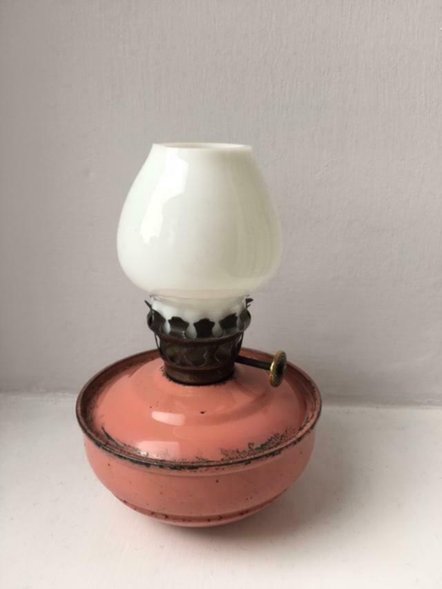 Title (ebay affiliate link): Vintage dusky pink enamel Kelly / Nursey paraffin lamp / milk glass shade