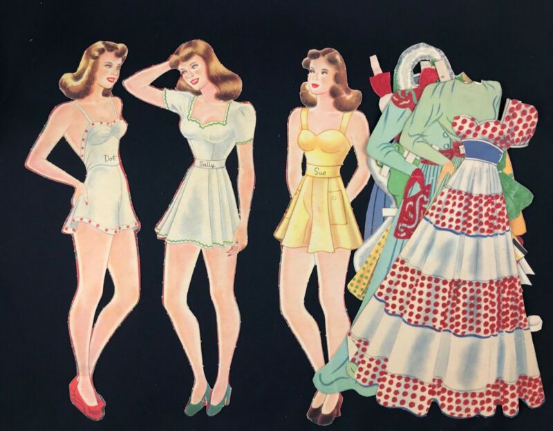 Title (ebay affiliate link): Vintage Three Sisters Paper Dolls, Sally, Sue and Dot with flocked clothing