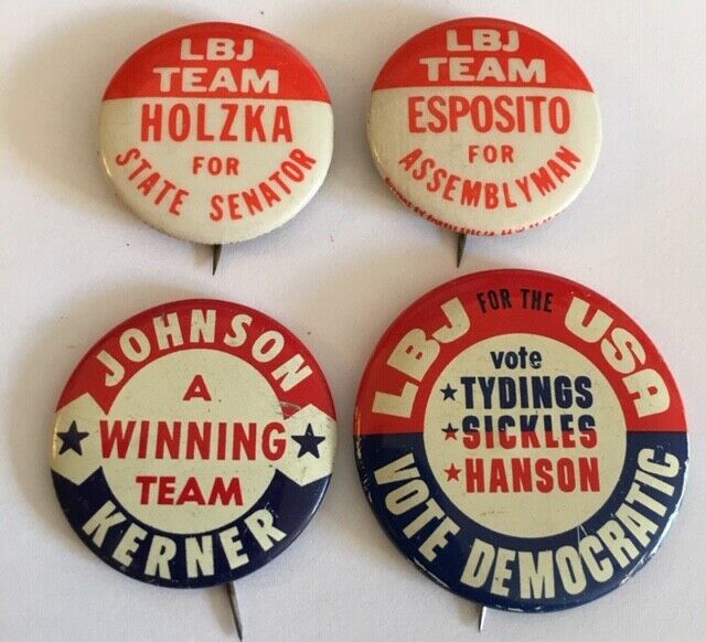 Title (ebay affiliate link): Two 1 1/4", One 1 1/2" and One 1 3/4" LBJ Coattail Campaign Pins