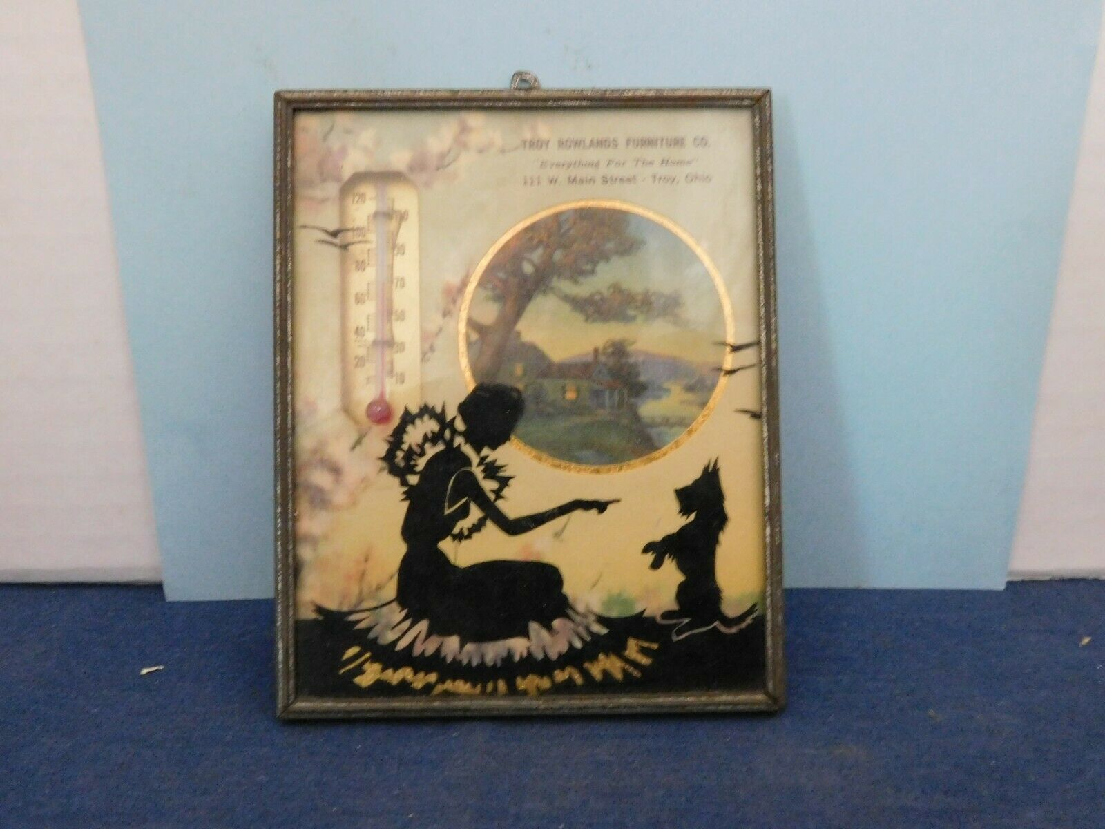 Title (ebay affiliate link): Vtg Reverse Painted Glass Advertising Thermometer Rowlands Furnature Woman Dog