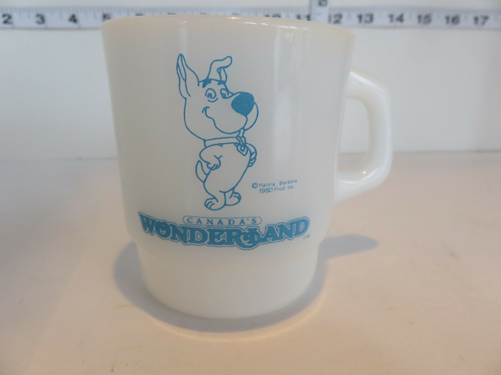 1980 SCRAPPY DOO MILK GLASS CANADA''S WONDERLAND COFFEE MUG HANNAH BARBERA