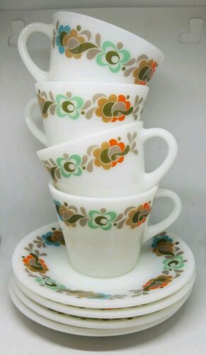 Vintage Pyrex JAJ England Carnaby Tempo flower milk glass tea cup saucer set 8pc