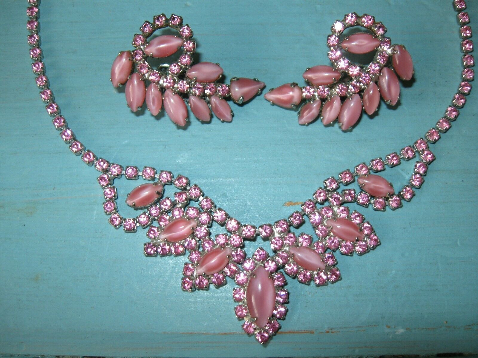 Vintage Pink Milk Glass Rhinestone Necklace & Earrings