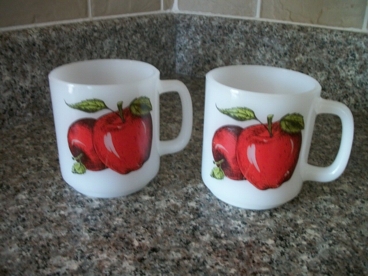 Title (ebay affiliate link): 2 Vintage Glasbake 8 oz White Milk Glass Coffee Mugs with Apple Design
