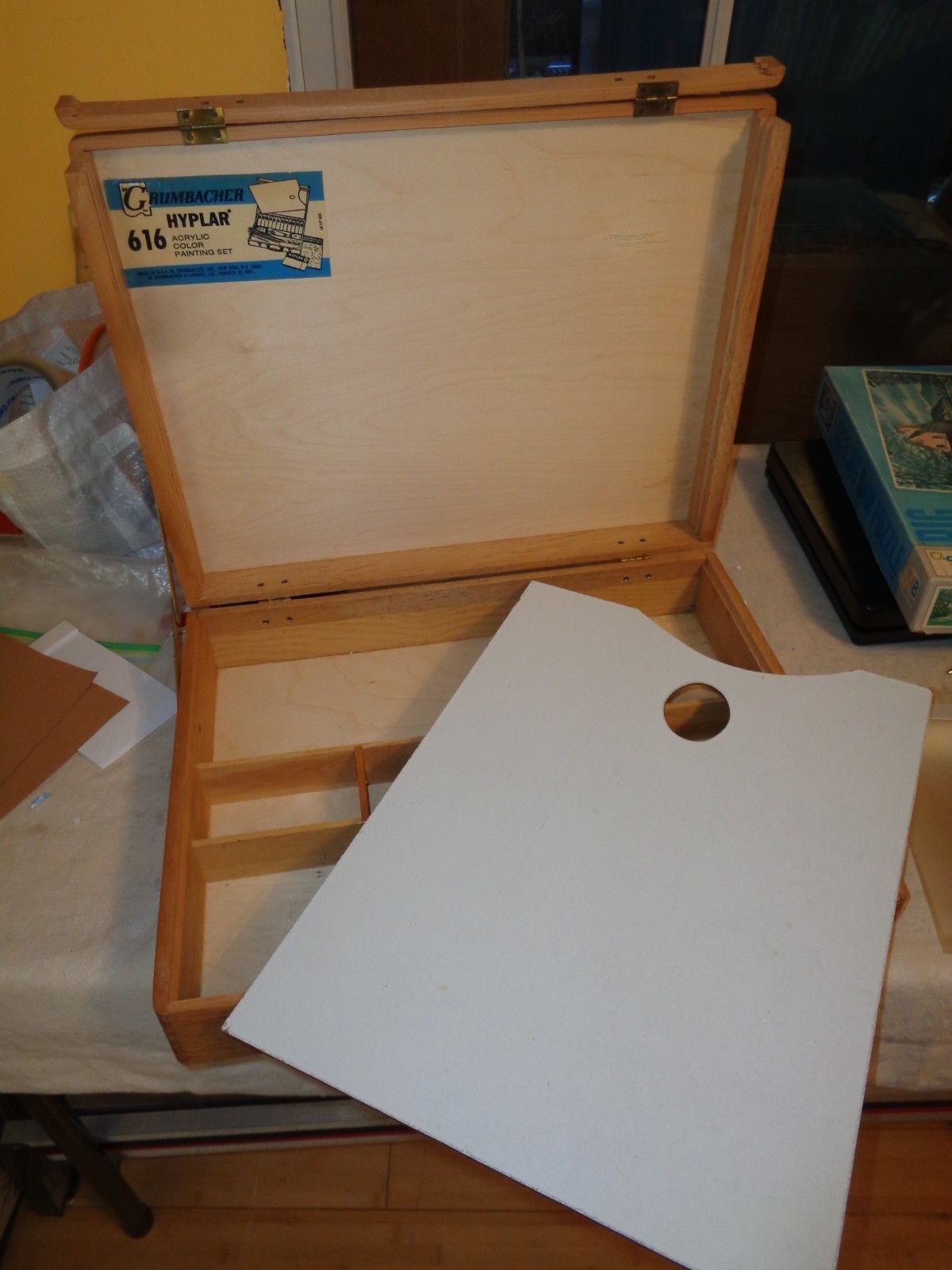 Title (ebay affiliate link): Vintage Grumbacher Wood Artists Art Paint Storage Box & Palette Finger Joints