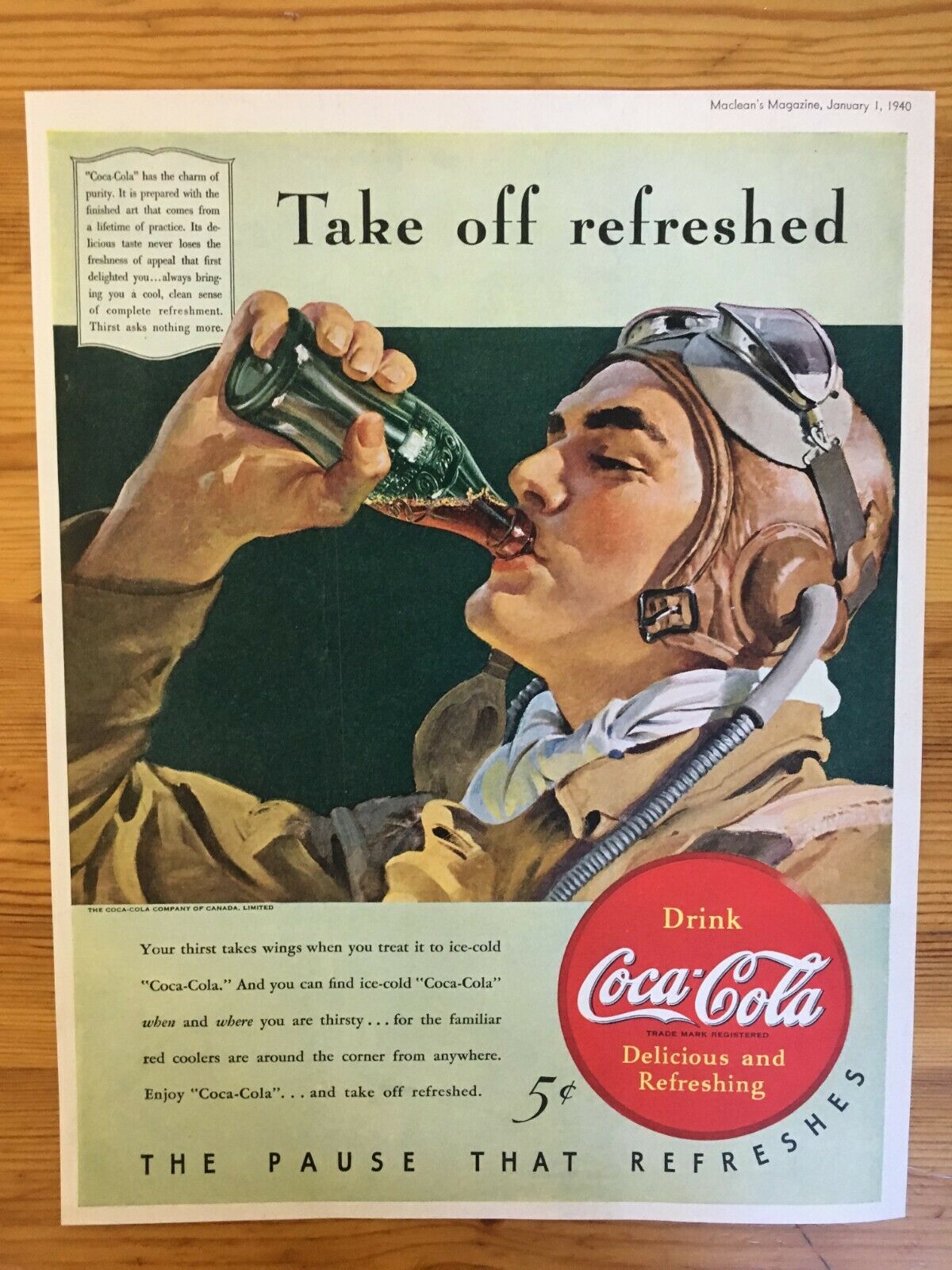 1940 CANADIAN CANADA COKE COCA COLA AD AVIATION WWII PILOT 5 CENTS