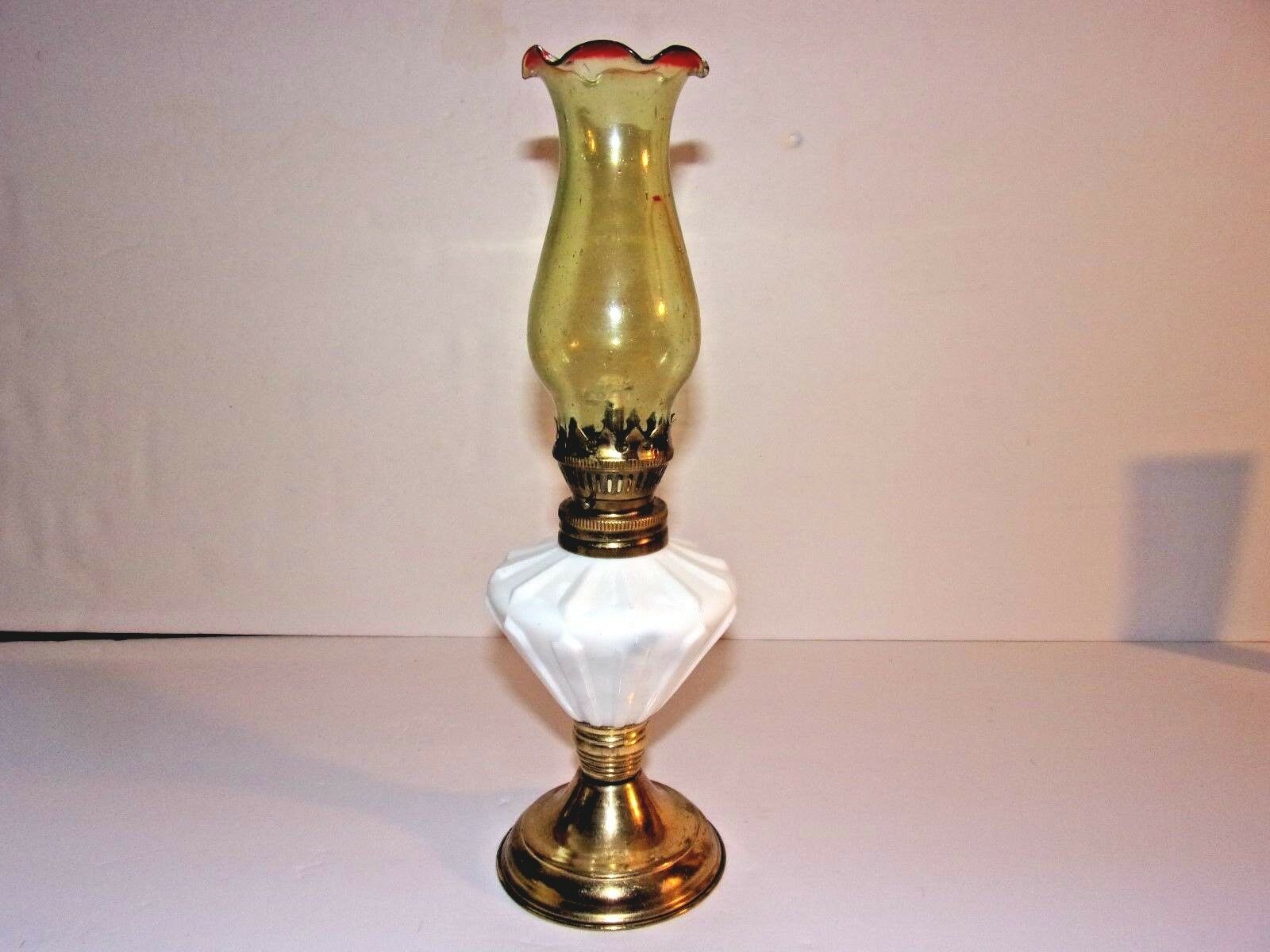 Title (ebay affiliate link): Mini Milk Glass and Brass Oil Lantern w/Green Tinted Chimney and Wick