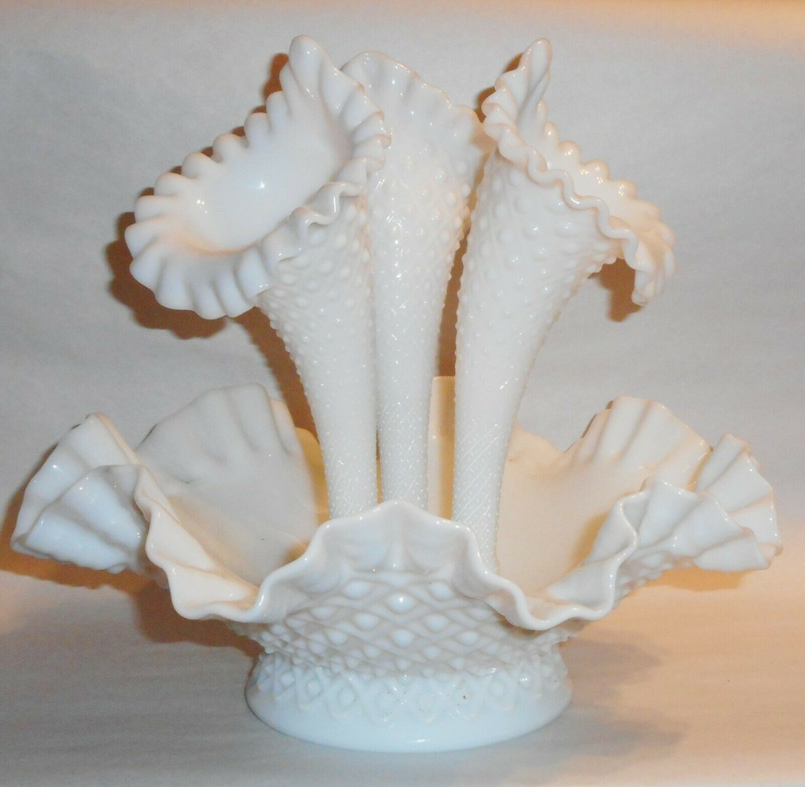 Vintage Diamond Lace 3 Horn Epergne White Milk Glass Art Glass Fenton Nice