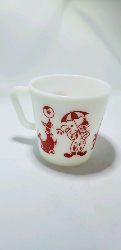 Title (ebay affiliate link): VINTAGE PYREX MILK GLASS CIRCUS CLOWN THEMED RED / WHITE HANDLED CUP MUG