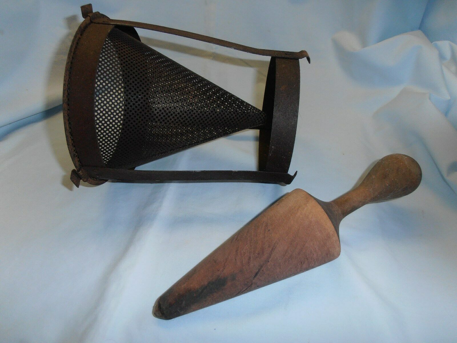 Title (ebay affiliate link): OLD ANTIQUE METAL COLANDER W/WOOD MASHER~NO MAKERS MARK~NO RES.