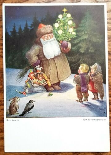 Father Christmas holding lighted Tree, Evening. Children. Lampe. Germany. Unused