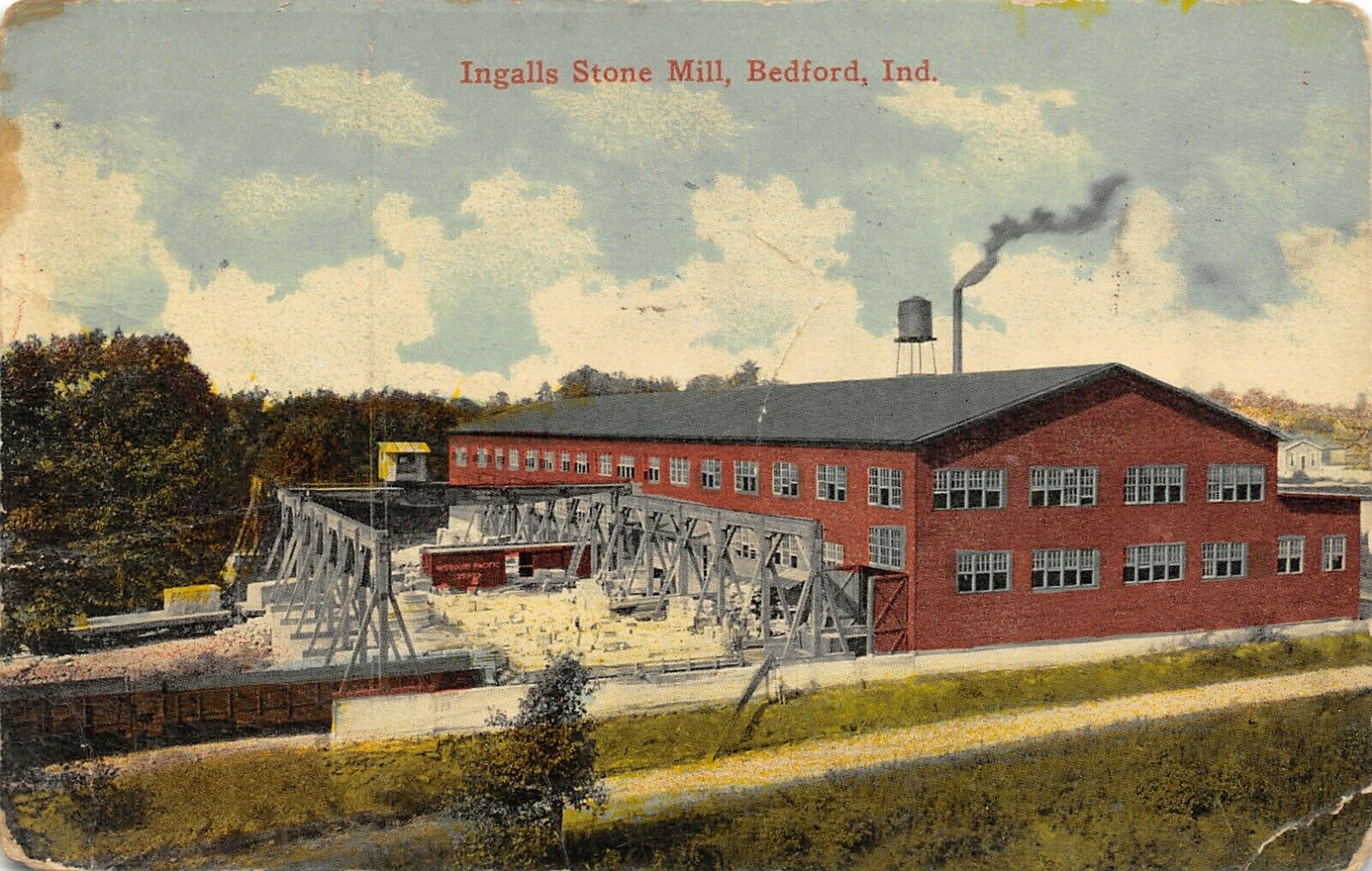 Title (ebay affiliate link): Bedford Indiana~Ingalls Stone Mill~Factory~Mo Pac RR Car~Water Tower~c1912 PC