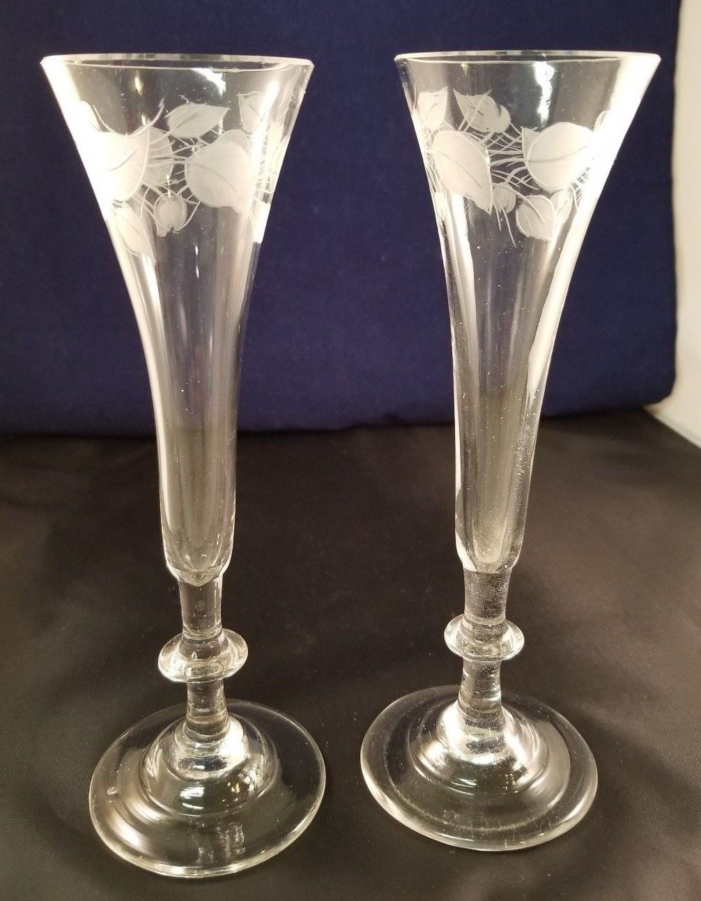 2 Old or Antique Etched & Applied Crystal Glass Champagne Flutes
