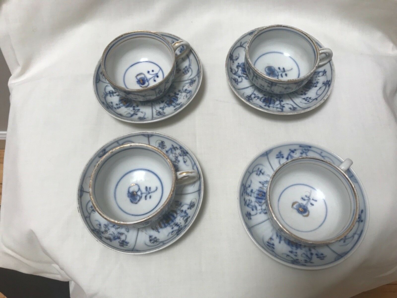 ANTIQUE GERMAN? SIGNED BLUE ONION SET FOUR CUPS WITH SAUCERS