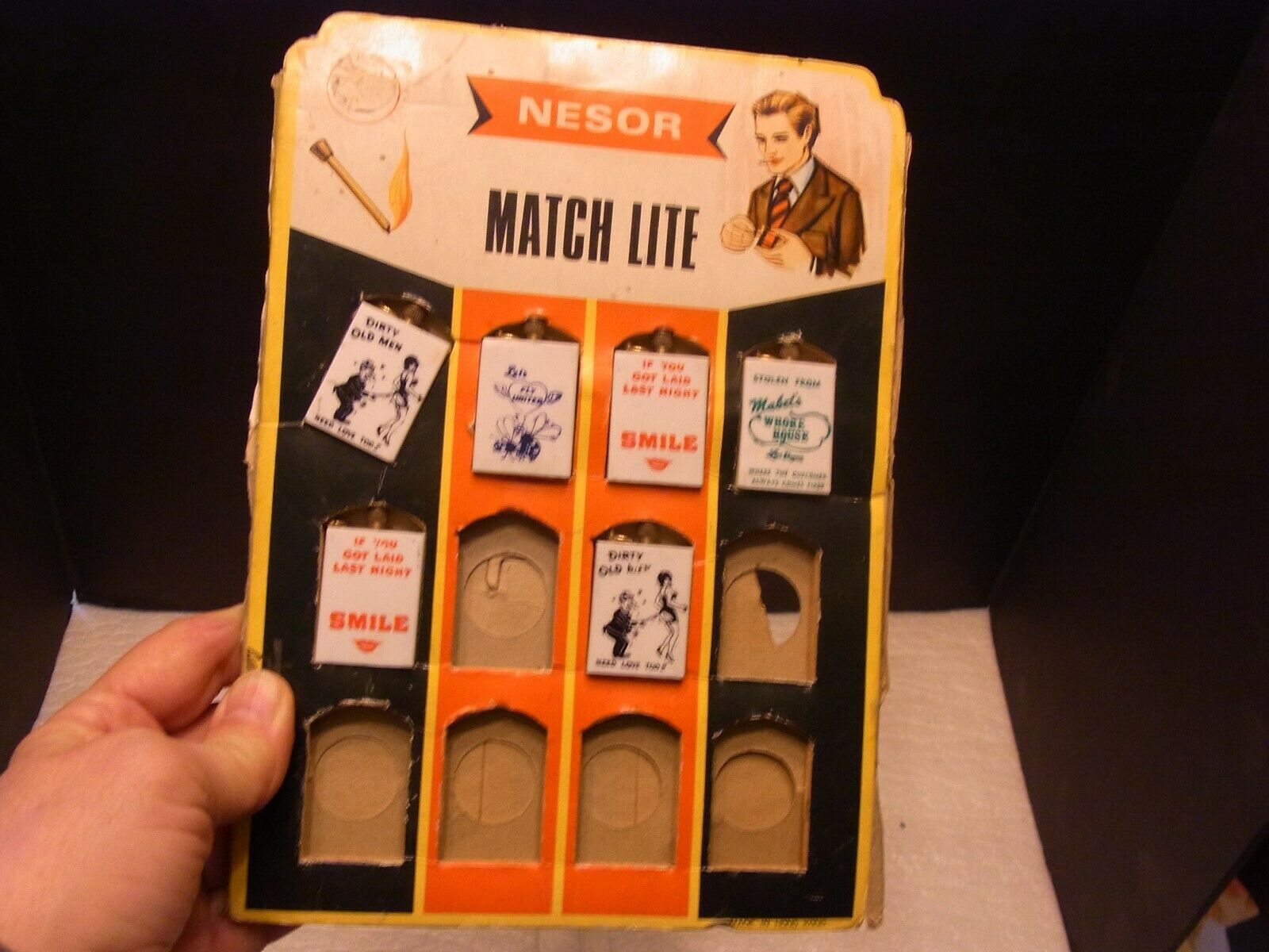 Title (ebay affiliate link): VINTAGE NESOR MATCH LITE STORE DISPLAY WITH 6 NOS COMIC LIGHTERS 7 X 10 EASEL
