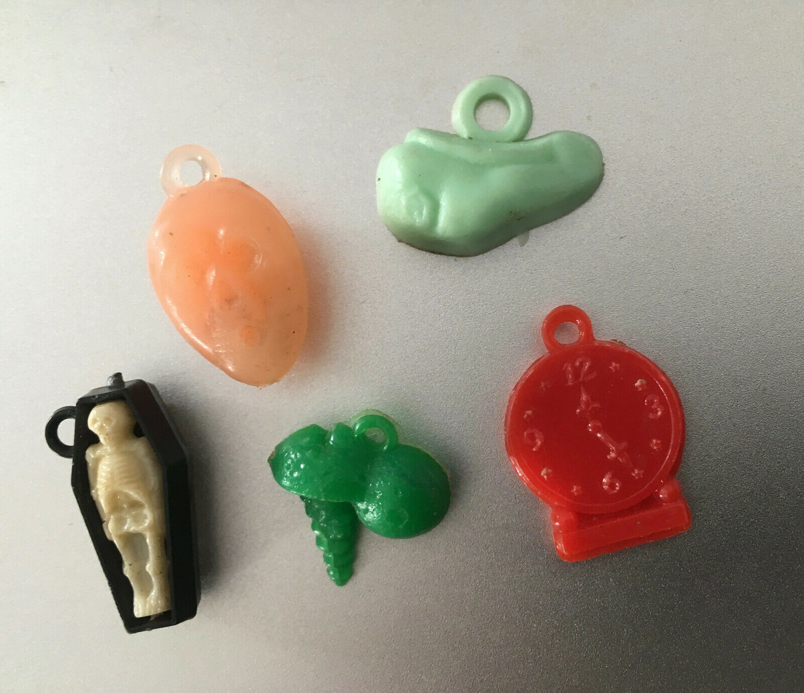 5 Vtg Plastic Cracker Jack Prize Toy Charms - Monster,Skeleton in Coffin,Beret +
