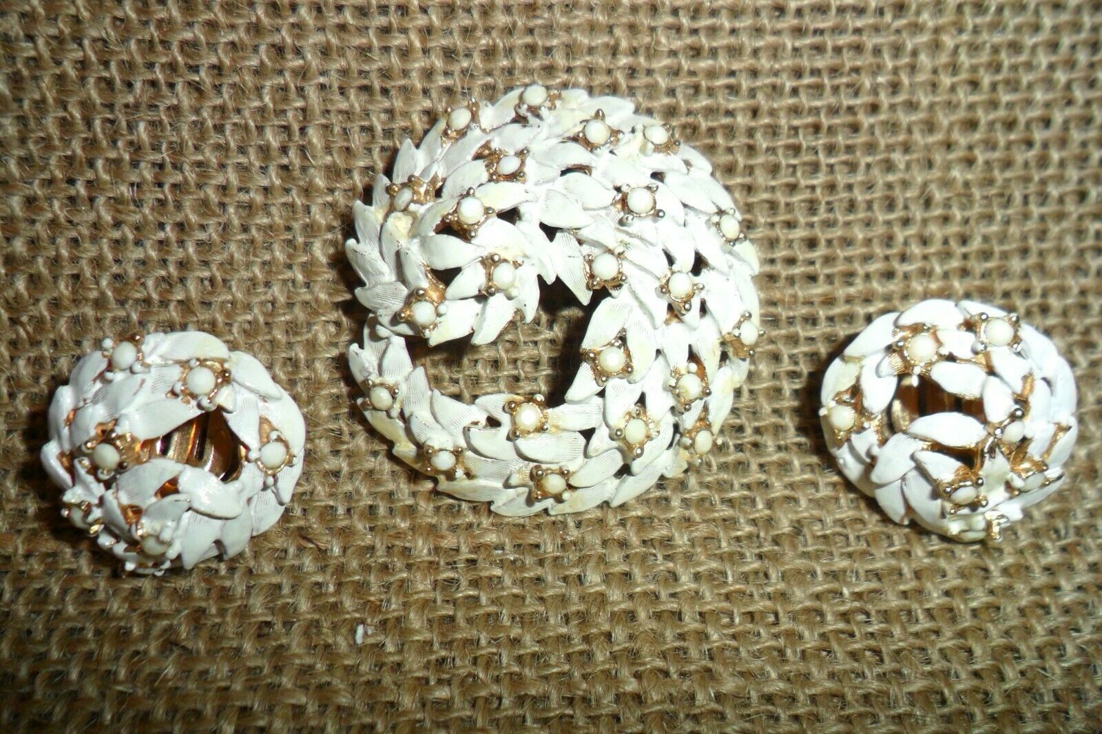 Title (ebay affiliate link): Vintage Brooch & Earring Set White Enamel & Milk Glass Rhinestone
