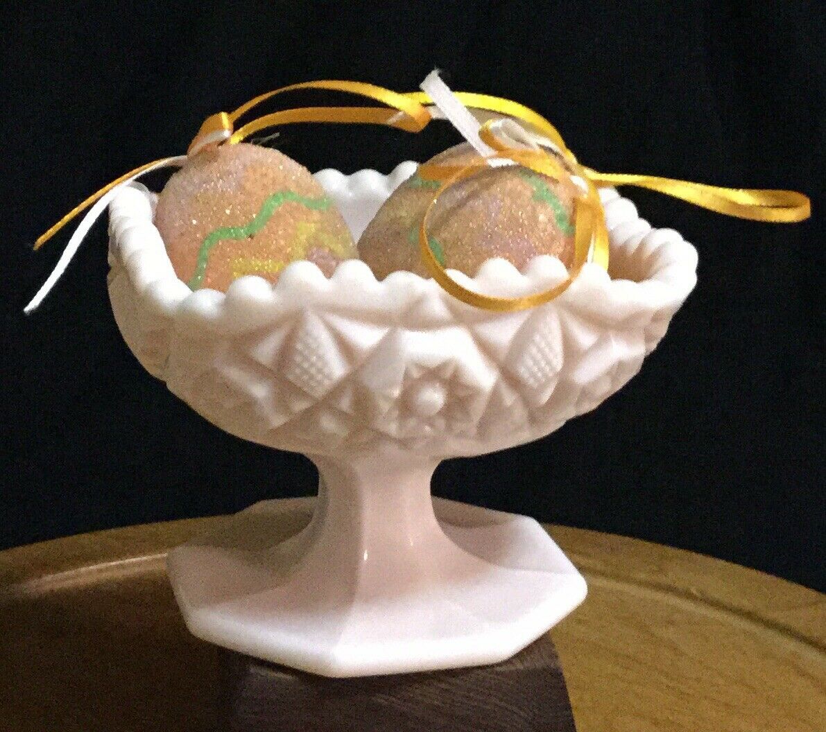 Title (ebay affiliate link): Vintage Pink Milk Glass-Pedestal Candy Dish-Great For Easter-Home Decor-50''s-60s