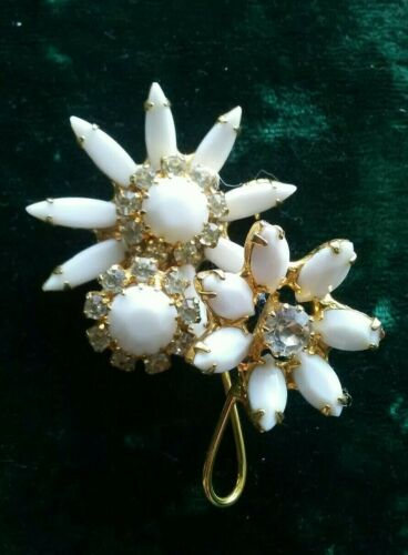 Title (ebay affiliate link): Vintage Juliana style milk glass and rhinestone flower brooch.