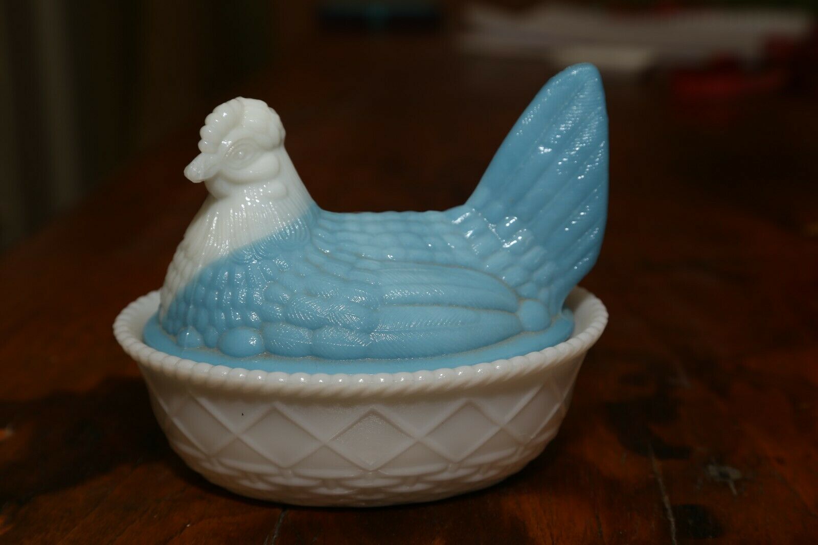 Title (ebay affiliate link): Vintage Milk Glass White & Blue Chicken Hen on Nest Trinket Dish Westmoreland?