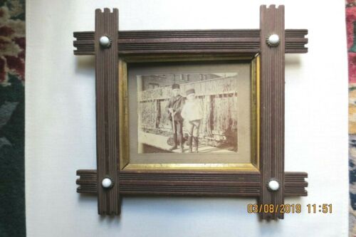 Title (ebay affiliate link): ANTIQUE TRAMP ART/ADIRONDACK/BLACK FORREST FRAME WITH PORCELAIN BUTTONS