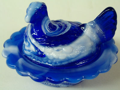COBALT MILK SLAG GLASS HEN CHICKEN ON NEST BASKET DISH