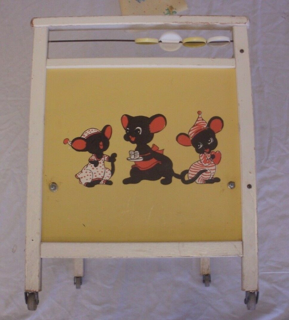 Title (ebay affiliate link): 1950s Wood Baby Doll Crib Design Spinners Padding Wheels 25.5 x 16 x 21, NR