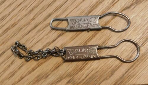 TWO ANTIQUE VINTAGE METAL KEY CHAIN DARLINGS FERTILIZER''S FARM ADVERTISEMENT