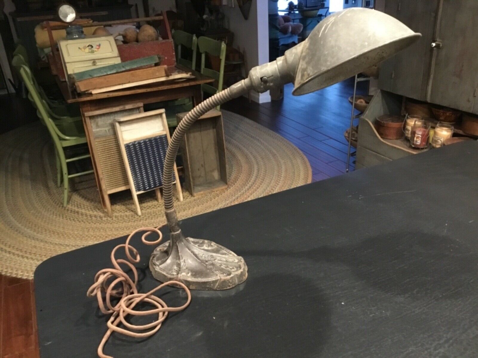 Title (ebay affiliate link): ANTIQUE INDUSTRIAL S.W. FARBER GOOSE NECK CAST IRON BASE DESK LAMP BROOKLYN NY