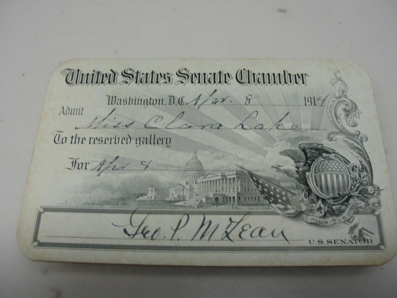 1914 UNITED STATES SENATE CHAMBER CARD VISITORS PASS