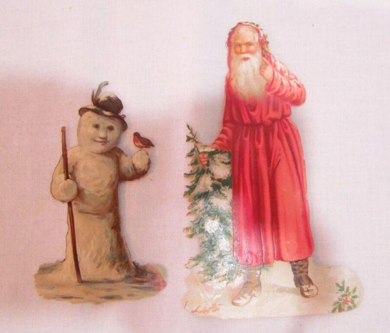 ANTIQUE VICTORIAN DIE CUT PAIR CHRISTMAS SNOWMAN & SANTA CLAUS ST. NICHOLAS TREE