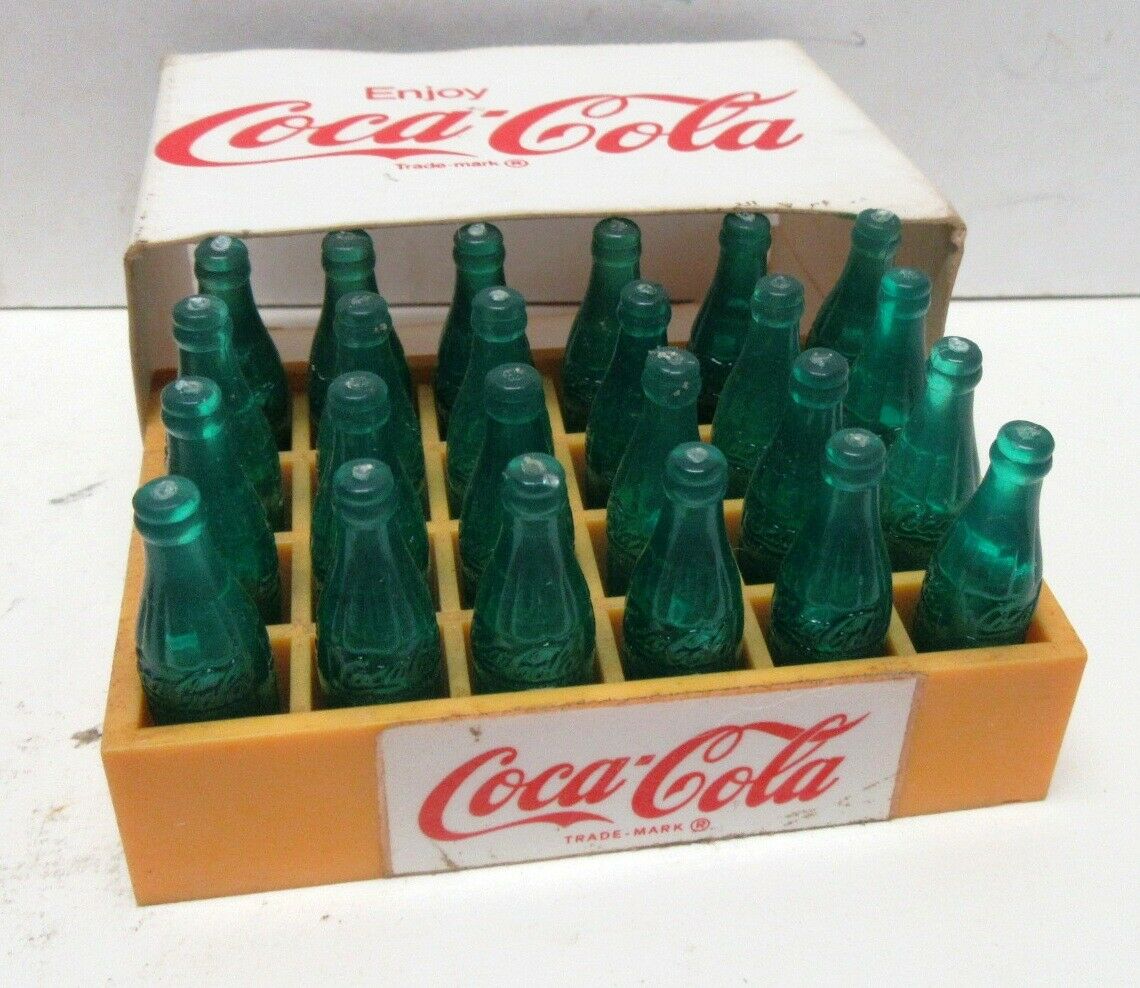 1960s YELLOW PLASTIC CASE WITH 24 1.5 INCH GREEN BOTTLES WITH COVER -SUPER NICE