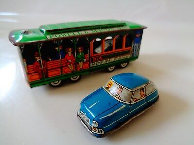 VINTAGE TIN TROLLEY CAR & SMALL CAR