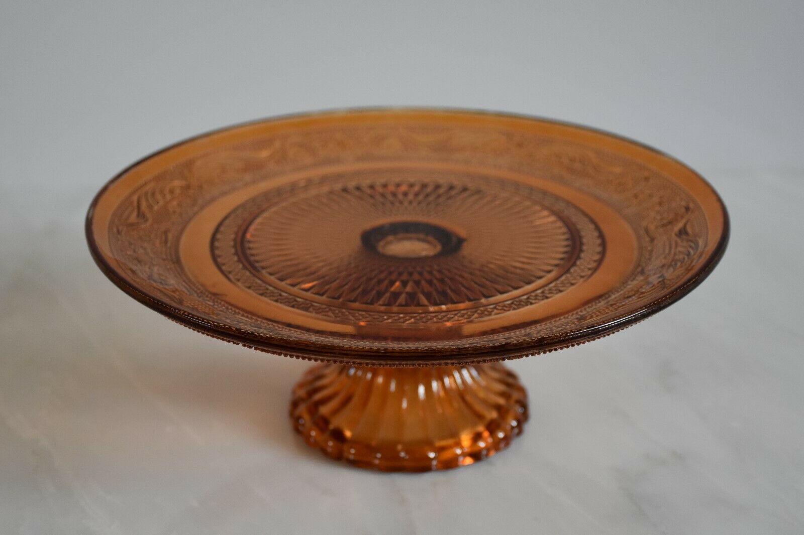 Kig Malaysian Depression Glass Deep Amber Fleur-De-Lis Pedestal Pastry Stand