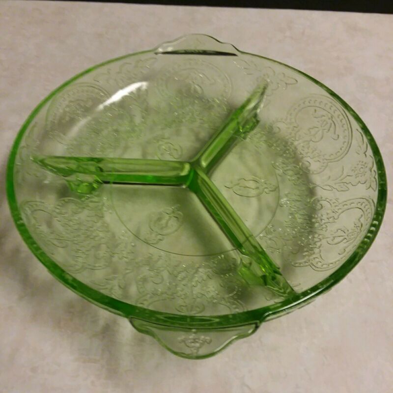 Title (ebay affiliate link): Depression Glass Green Relish Dish Horseshoe Pattern