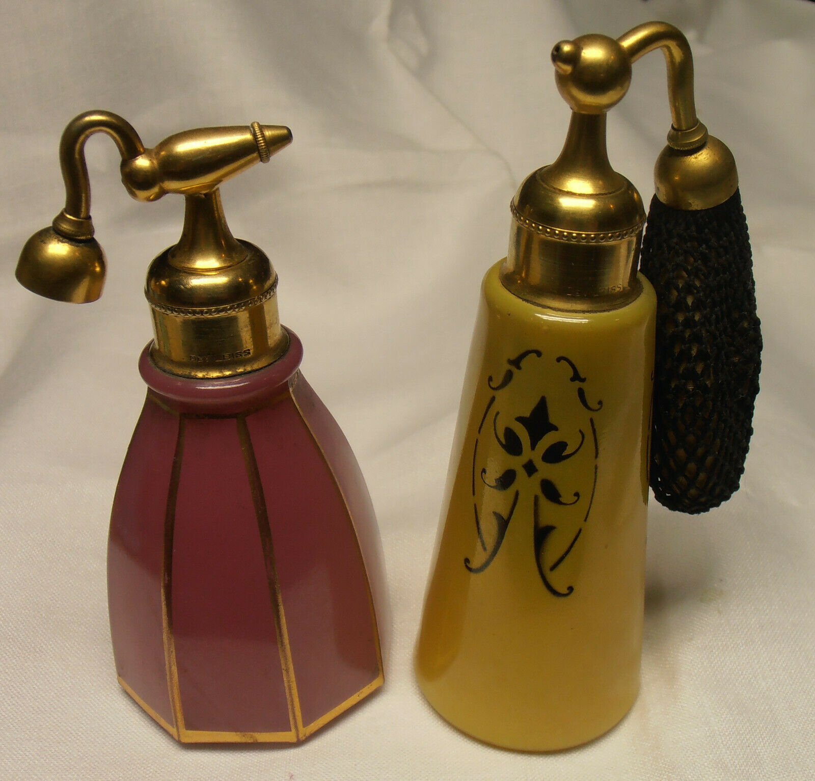 2 ANTIQUE/VINTAGE PINK AND YELLOW signed "DeVilbiss" ATOMIZERS PERFUME BOTTLES