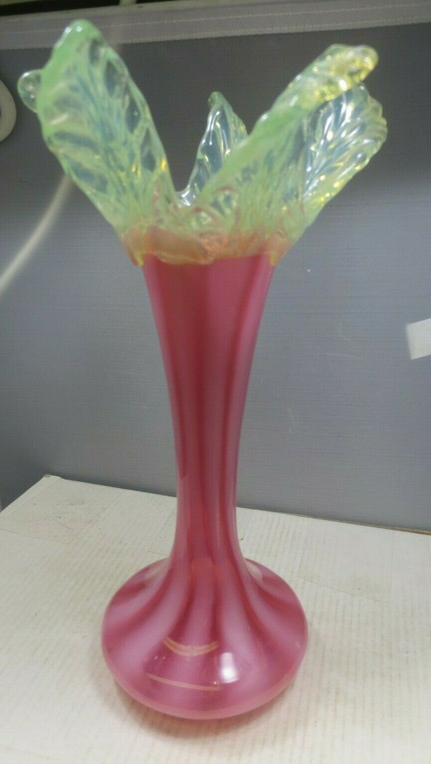 Victorian Art Glass Vase With Five Light Green Shape Leaf Rim Vertical Bands On