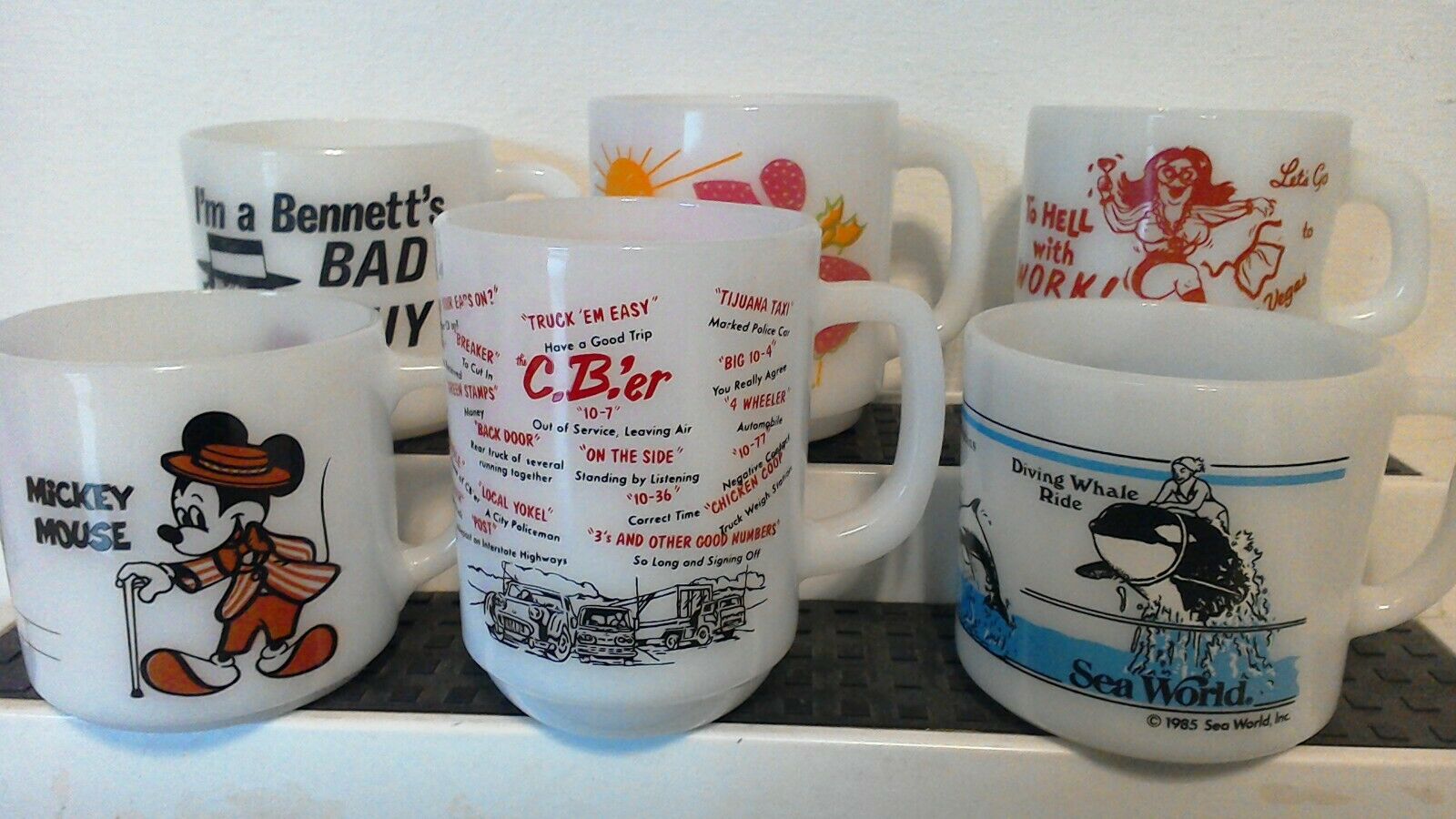 Title (ebay affiliate link): 6 Vintage Fire King AH Mixed Milk Glass Advertising Coffee Mug Lot Federal etc