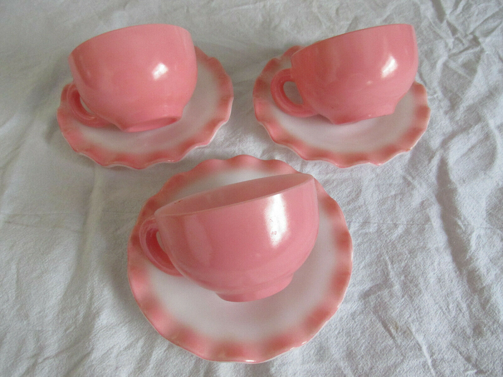 3 Hazel Atlas CRINOLINE PINK Milk Glass: CUPS & RUFFLE EDGE SAUCERS