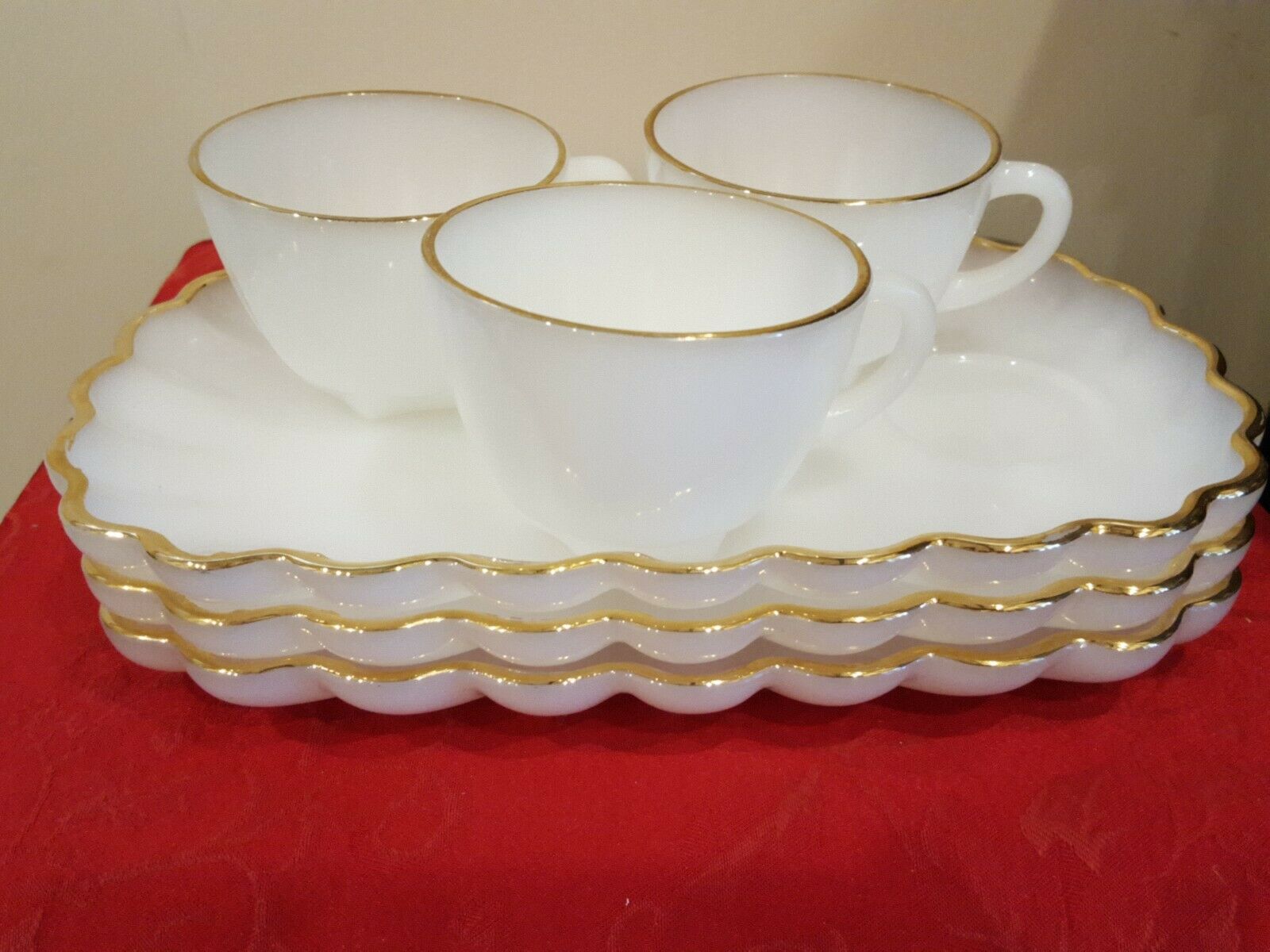 VINTAGE 6 PC ANCHOR HOCKING MILK GLASS SNACK SET 22K GOLD 3 PLATES 3 CUPS MINT