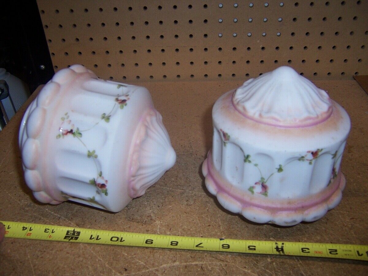 ANTIQUE VINTAGE MILK GLASS PENDANT LIGHT SHADES painted garlands Pair