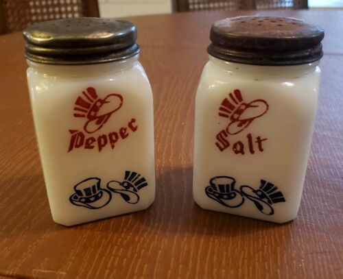 Title (ebay affiliate link): Uncle Sam Hats Milk Glass Salt & Pepper Shakers (Hazel Atlas?)