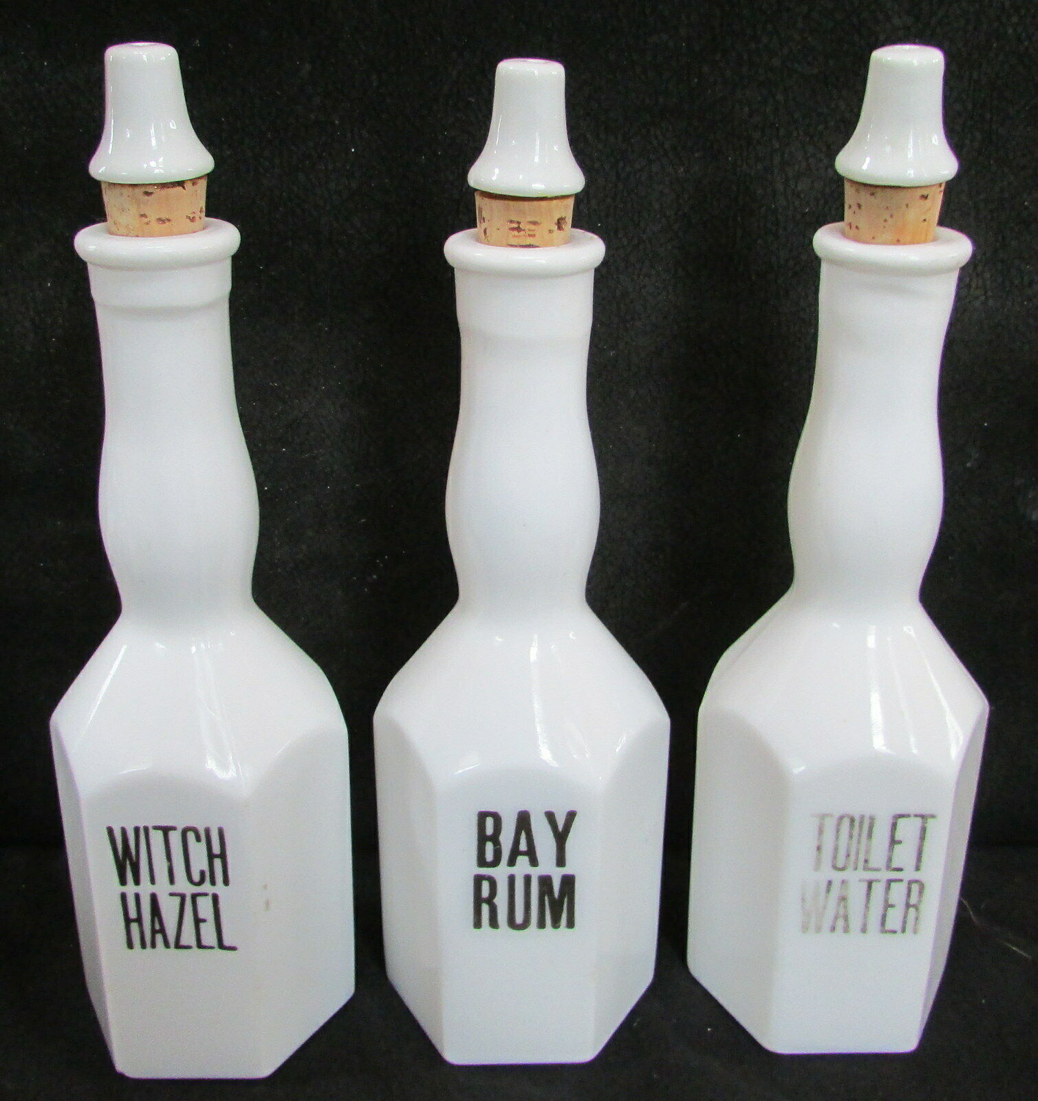 THREE 1900''s WHITE MILK GLASS BARBER SHOP BOTTLES BAY RUM - WATER -WITCH HAZEL