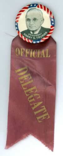 Title (ebay affiliate link): Vintage 1948 President Harry S. Truman Campaign Pinback Button Ribbon-Delegate