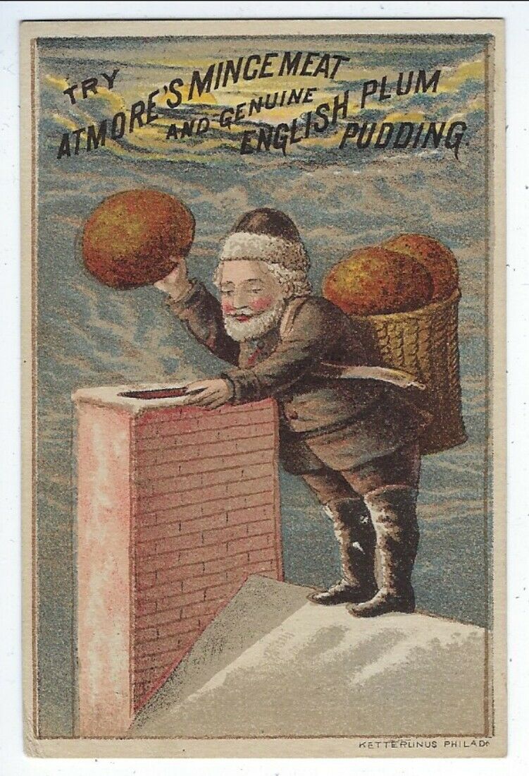 Title (ebay affiliate link): Atmore''s Mince Meat, English Pudding: Santa Throws Pudding Down Chimney, 1880s