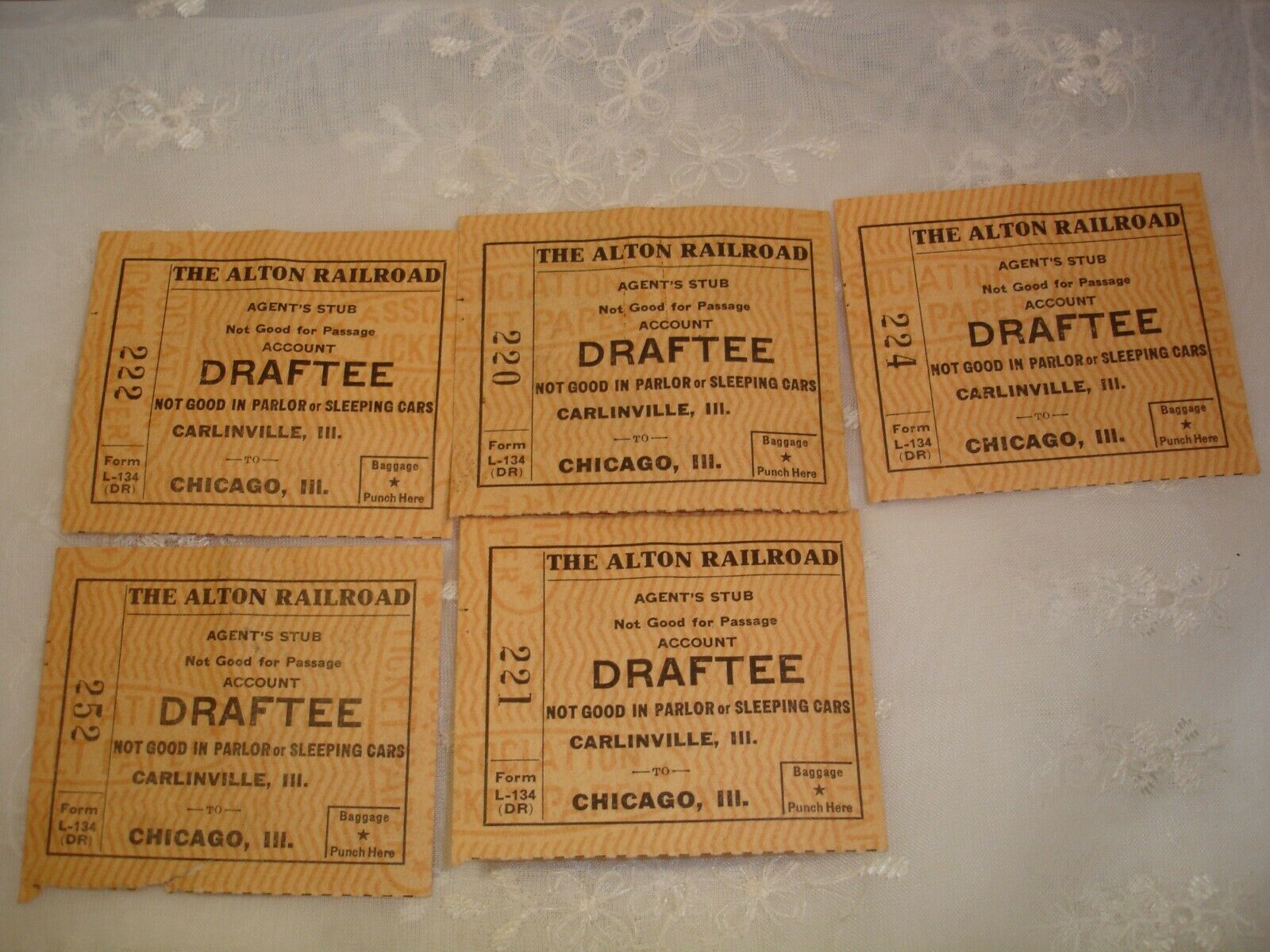 Lot of 5 The Alton Railroad "DRAFTEE" Agent''s Stubs 1945 WW II