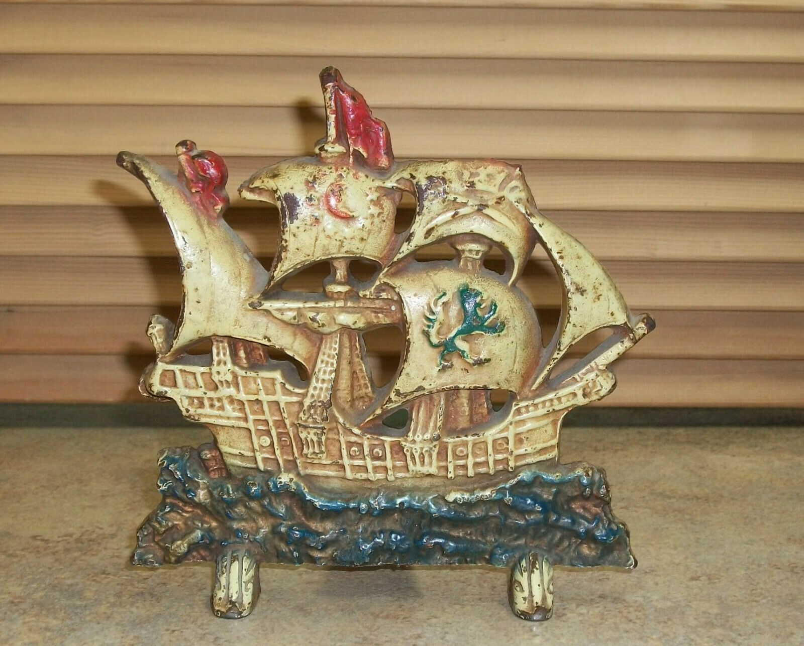 Vintage Cast Iron Heavy Doorstop Ship with Sails