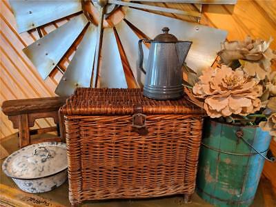 PRIMITIVE FARMHOUSE WICKER FISHING BASKET TACKLE BOX SEAT CREEL LAKE CABIN DECOR