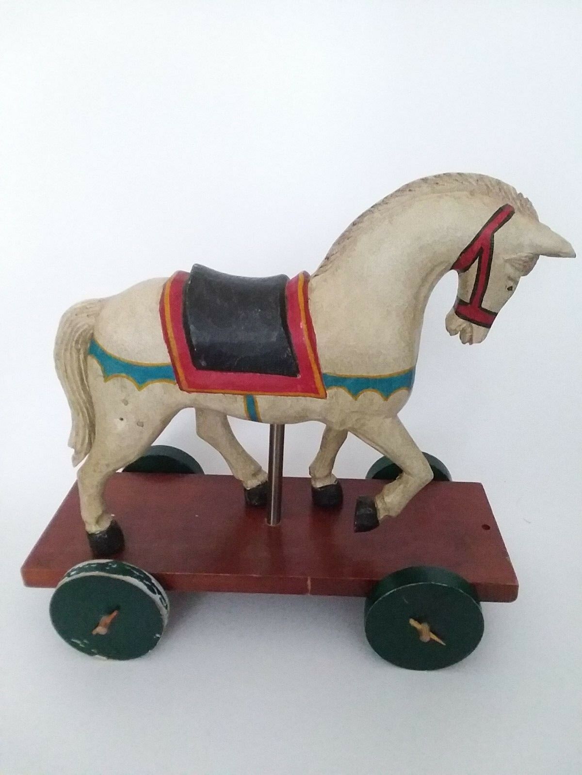 Title (ebay affiliate link): Nice Old American Folk Art Miniature Carousel Horse Pull Toy Wood Carving